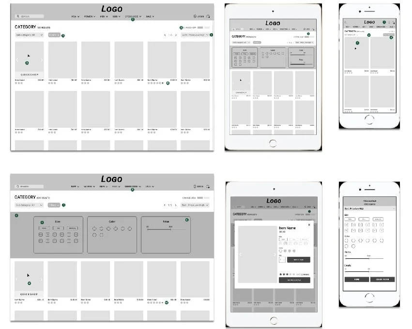 Once the web-based wireframe turned out well, I worked on creating responsive wireframes for the catalog page since the content layout of the page generally tend to be the busiest and numbers of my research participants pointed out that their frustration with most e-commerce sites are on the catalog page.